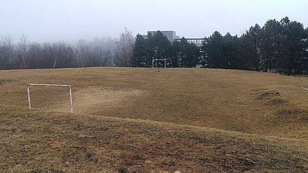 Místo, kde by nové školní hřiště mělo vzniknout. Momentálně je na něm hliněno-travnatý plácek na fotbal.