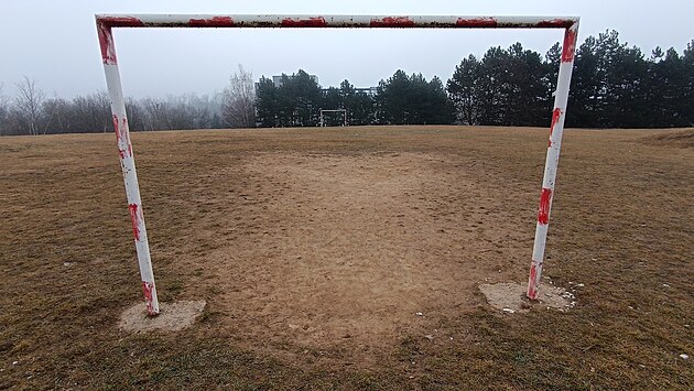 Místo, kde by nové školní hřiště mělo vzniknout. Momentálně je na něm hliněno-travnatý plácek na fotbal.