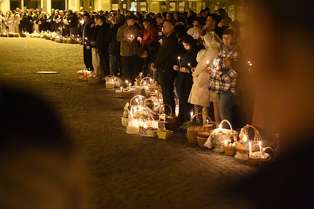 Tři tisíce věřících, převážně Ukrajinců, se v noci ze soboty na neděli zúčastnilo v jihlavském chrámu sv. Ignáce pravoslavné velikonoční bohoslužby. (20. dubna 2025)