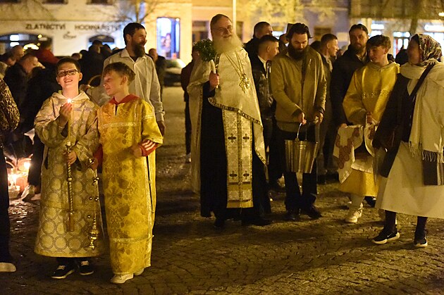 Tři tisíce věřících, převážně Ukrajinců, se v noci ze soboty na neděli zúčastnilo v jihlavském chrámu sv. Ignáce pravoslavné velikonoční bohoslužby. (20. dubna 2025)