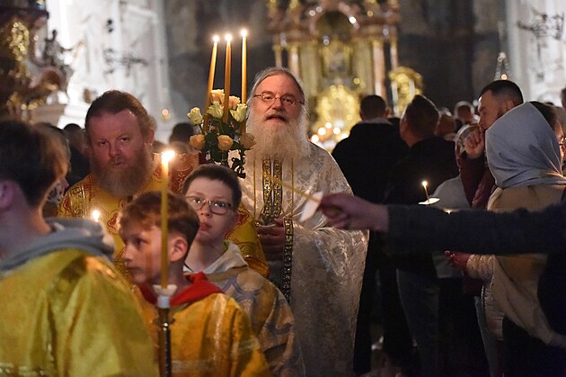Tři tisíce věřících, převážně Ukrajinců, se v noci ze soboty na neděli zúčastnilo v jihlavském chrámu sv. Ignáce pravoslavné velikonoční bohoslužby. (20. dubna 2025)