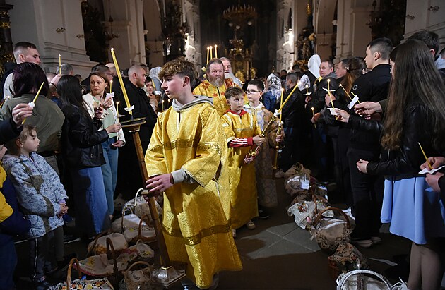 Tři tisíce věřících, převážně Ukrajinců, se v noci ze soboty na neděli zúčastnilo v jihlavském chrámu sv. Ignáce pravoslavné velikonoční bohoslužby. (20. dubna 2025)
