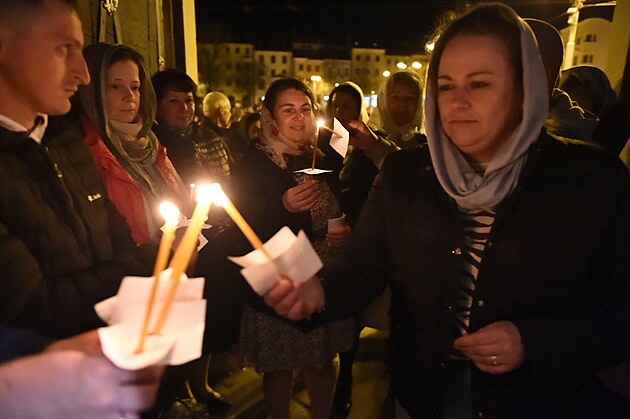 Tři tisíce věřících, převážně Ukrajinců, se v noci ze soboty na neděli zúčastnilo v jihlavském chrámu sv. Ignáce pravoslavné velikonoční bohoslužby. (20. dubna 2025)