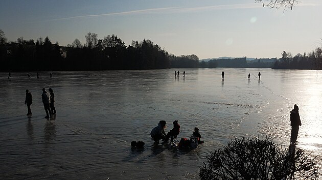 I když led není úplně hladký, jsou na něm hrboly a praskliny, bruslaři si jej umí užít. Desítky lidí v neděli křižovaly například Váňovský rybník v Třešti na Jihlavsku (na snímku).