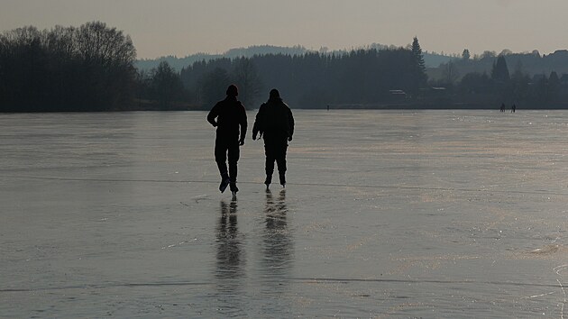 I když led není úplně hladký, jsou na něm hrboly a praskliny, bruslaři si jej umí užít. Desítky lidí v neděli křižovaly například Váňovský rybník v Třešti na Jihlavsku (na snímku).