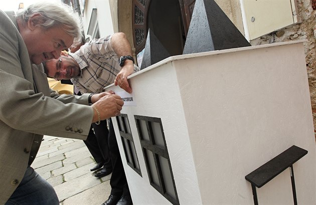 A tak model krematoria stojí na pelhřimovském Masarykově náměstí před radnicí. Po celý týden budou mít lidé možnost přijít a dovnitř vhodit své popsané trápení. Připraveny jsou na to vedle krematoria papírky a tužky.
