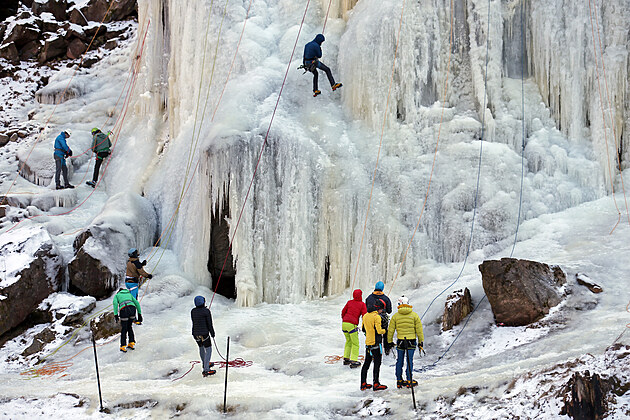 Ledová stěna ve Víru zahájila zimní sezonu. Kvůli nestálému počasí se tak stalo výjimečně pozdě. (20. února 2025)