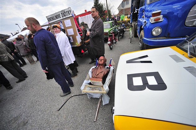 V průvodu nechybělo v duchu doby ani trio mladíků v sepraných „džískách“ na malých motocyklech, letadlo i s vrtulí a letcem či opentlený vůz jásajících dětí z mateřské školy.