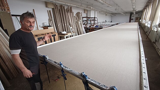 Příprava samotných pláten probíhá v patře. Lněné plátno zde pracovníci natáhnou na 24 metrů dlouhý rám a postupně ho klíží a šepsují.