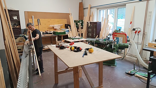 Součástí přibyslavského provozu je i truhlářská dílna. V ní si firma sama připravuje dřevěné latě. Tak dlouhé, jak potřebuje, totiž běžně k dostání nejsou.