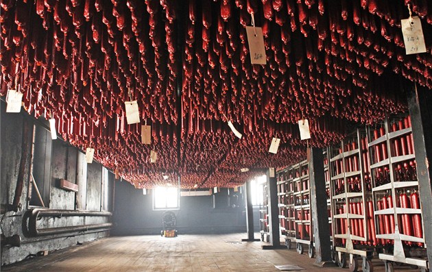 Sušárna. U stropu visí tisíce štanglí a kanálky v podlaze do těch prostor od spodu proniká dým. Salámy si tu pobudou deset až čtrnáct dnů.