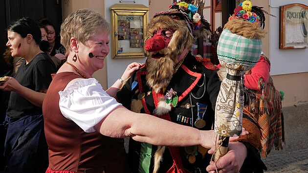 Studnické maškary obcházely některé provozovny v centru Žďáru. Čekalo je vřelé přijetí i pohoštění.