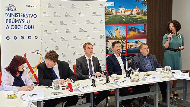 Ministr průmyslu a obchodu Lukáš Vlček (uprostřed) informuje v Třebíči o harmonogramu dostavby dukovanské elektrárny.