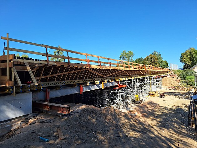 Do další fáze se dostala stavba silničního mostu na silnici 38 u Habrů. Spodní část mostu už je dokončená, práce se posouvají k betonáži nosné konstrukce.