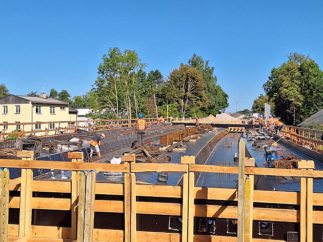 Do další fáze se dostala stavba silničního mostu na silnici 38 u Habrů. Spodní část mostu už je dokončená, práce se posouvají k betonáži nosné konstrukce.