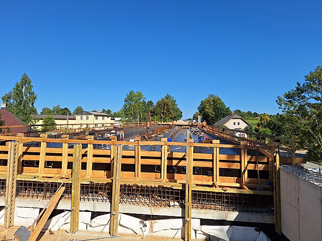 Do další fáze se dostala stavba silničního mostu na silnici 38 u Habrů. Spodní část mostu už je dokončená, práce se posouvají k betonáži nosné konstrukce.