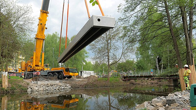 Dva betonové díly budoucího mostu, každý o váze 15 tun, položil ve Žďáře přes řeku Sázavu jeřáb.