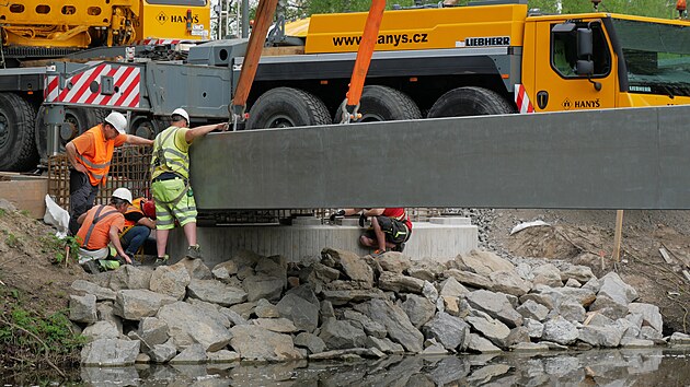 Dva betonové díly budoucího mostu, každý o váze 15 tun, položil ve Žďáře přes řeku Sázavu jeřáb.