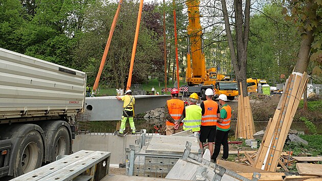 Dva betonové díly budoucího mostu, každý o váze 15 tun, položil ve Žďáře přes řeku Sázavu jeřáb.