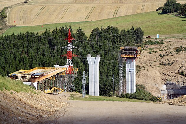 Všechny nejvyšší pilíře vysokého silničního mostu na budoucím obchvatu Brtnice už stojí. Jeden z nich se právě dokončuje, další již jsou postaveny.