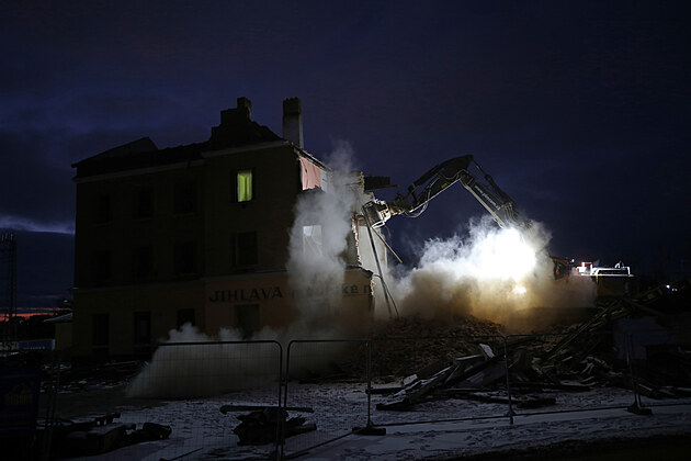 Demoliční stroj během několika dnů proměnil historickou nádražní budovu v hromadu sutin. Snímek z večerního bourání je z 13. ledna, ve středu už z budovy z roku 1870 zbývalo jenom pouhé torzo v podobě západní stěny se štítem.