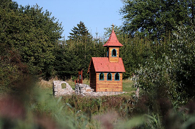 Dřevěná maketa malé kaple je posledním zastavením naučné stezky na okraji mokřiny u Štěměch, přes kterou vede dál haťový chodník.