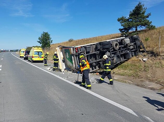 Nehoda nákladního auta a autobusu na D1. Lehce zraněn byl řidič nákladního vozu, drobně ošetřit se nechal i jeden cestující z autobusu. (26. srpna 2025)