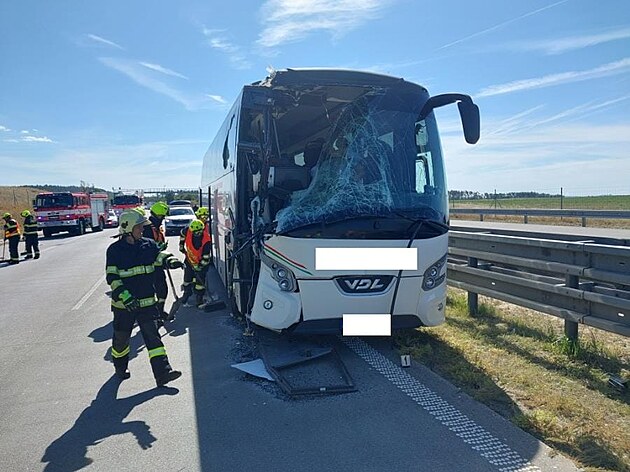 Nehoda nákladního auta a autobusu na D1. Lehce zraněn byl řidič nákladního vozu, drobně ošetřit se nechal i jeden cestující z autobusu. (26. srpna 2025)