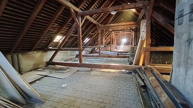Stav krovu stavebníky překvapil. Pozitivně. Je suchý a v dobrém stavu. Trámoví se po rekonstrukci prostor ovšem skryje za sádrokartonové desky.