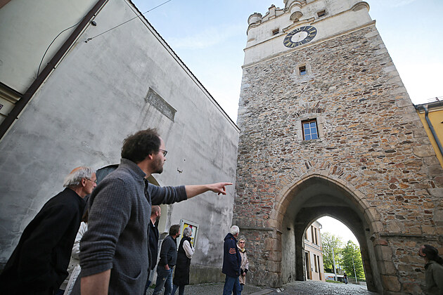 Koordinátor Jihlavského architektonického manuálu a zastánce omítnutí jihlavské brány Matky Boží Jiří Neubert ukazuje po ukončení veřejné diskuse minulé stavební zásahy do věže.