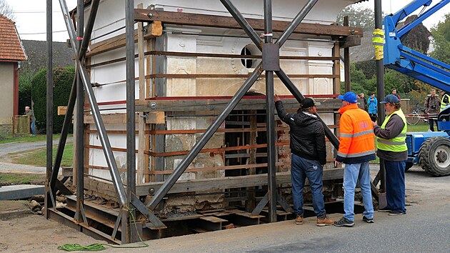 Přesun kaple v obci Křídla na Žďársku. Celá historická stavba se s pomocí jeřábu stěhovala dál od silnice.