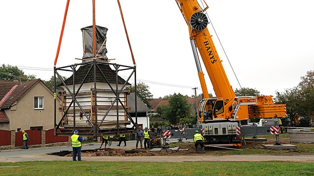 Přesun kaple v obci Křídla na Žďársku. Celá historická stavba se s pomocí jeřábu stěhovala dál od silnice.