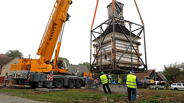 Přesun kaple v obci Křídla na Žďársku. Celá historická stavba se s pomocí jeřábu stěhovala dál od silnice.