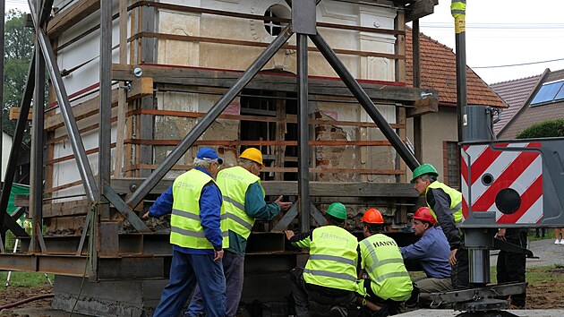 Přesun kaple v obci Křídla na Žďársku. Celá historická stavba se s pomocí jeřábu stěhovala dál od silnice.