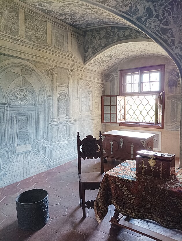 Sgrafitová výzdoba Klenotnice v přízemí starého hradu.