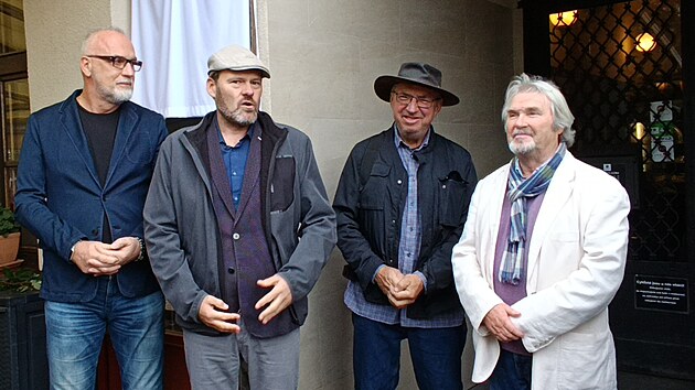 Odhalení pamětních desek na Panském domě v centru Chotěboře. Na snímku jsou zleva Pavel Halama, starosta města Ondřej Kozub, Radomír Dvořák a Richard Hašek.