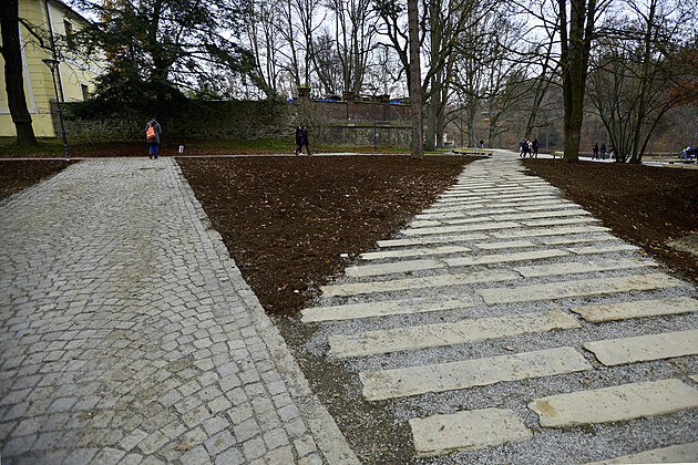 Netradiční je v parku kombinace povrchů. Přítomen je asfalt, dlažební kostky, klasická dlažba i třeba tyto starší obrubníky.
