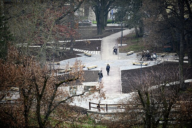 Nová síť cest v nově upraveném havlíčkobrodském parku se dvěma „kruháky“ vynikne hlavně z nadhledu. A ještě lépe bude vypadat, až se na jaře zazelenají tráva i veškeré dřeviny. Takto vypadá pohled na nově upravenou část od sochy Karla Havlíčka Borovského.