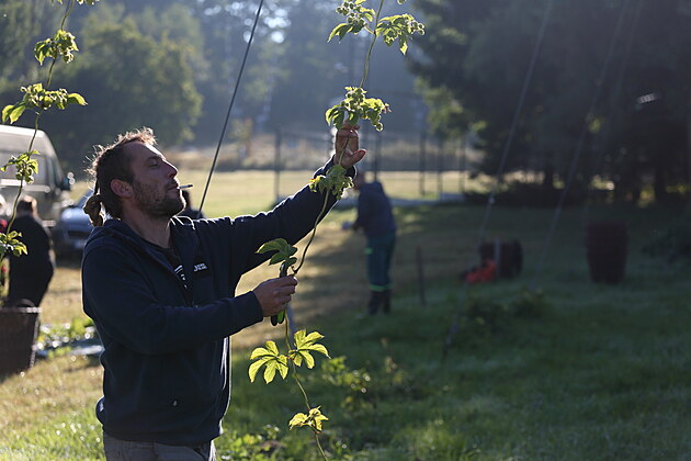 Česání chmele na nejvýše položené chmelnici v České republice. Nachází se v Humpolci v nadmořské výšce 560 metrů nad mořem. Pivovar Bernard ze zdejšího chmele uvaří speciální jedenáctku. (16. září 2025)