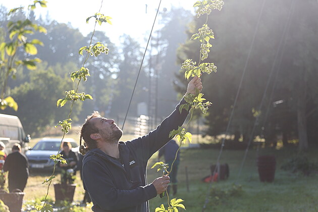 Česání chmele na nejvýše položené chmelnici v České republice. Nachází se v Humpolci v nadmořské výšce 560 metrů nad mořem. Pivovar Bernard ze zdejšího chmele uvaří speciální jedenáctku. (16. září 2025)