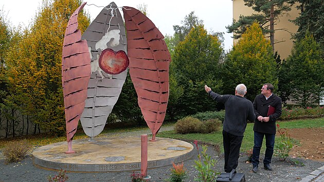 Své nejnovější dílo, na němž pracoval půl roku, představil přímo jeho autor, výtvarník Miloš Šedivý (vlevo). Na snímku je s bystřickým místostarostou Emilem Ondrou.