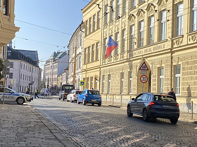 Evakuace Základní školy Křížová v Jihlavě. Anonym v ní nahlásil uložení bomby. (3. října 2025)