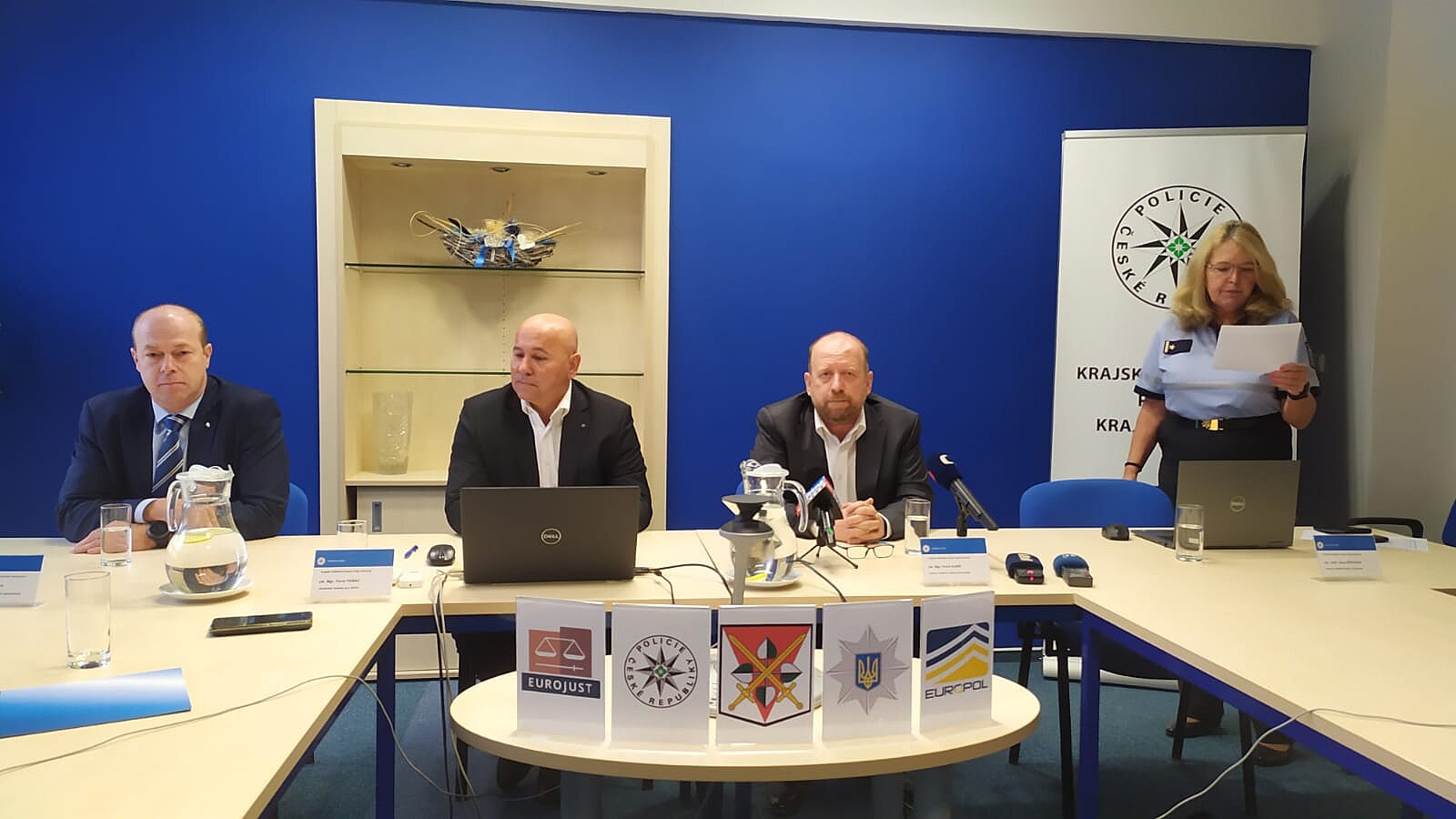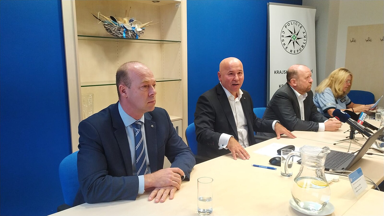 O případu falešného bankéře informovala policie v Jihlavě. Na snímku je (zleva) Libor Předota, vedoucí odboru operativní spolupráce Ředitelství pro mezinárodní policejní spolupráci, náměstek ředitele kriminálky na Vysočině Pavel Peňáz a vedoucí týmu jihlavských vyšetřovatelů Pavel Kubiš. Vpravo je policejní mluvčí Dana Čírtková.
