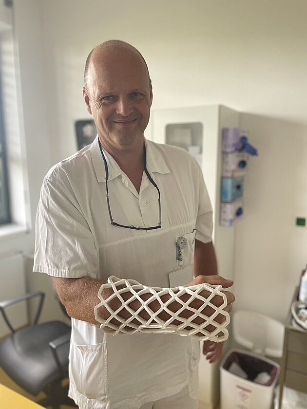 Fixaci tvoří plastové síťované čtverce. Ty se rozehřejí ve speciální troubě a lékař je následně vytvaruje přímo na ruce pacienta.