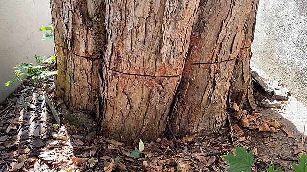 Ve školním dvoře kdosi po obvodu nařezal pilou kmen mohutného javoru