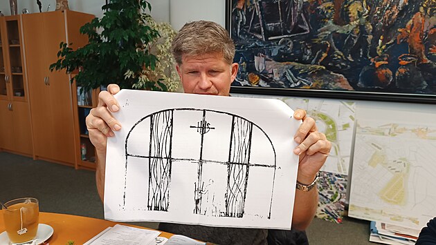Přibyslavský farář Pavel Sandtner představuje náčrt nového vstupního portálu do kostela svatého Jana Křtitele. Jedná se o kovovou konstrukci se symbolem Mojžíšova keře.