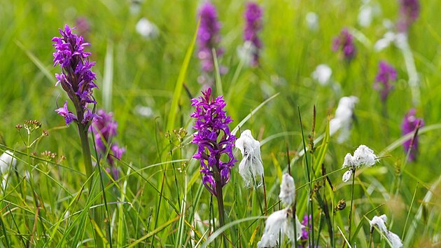 Podmáčenou lokalitu oživují v květnu a červnu fialové květy vzácných orchidejí - například prstnatce májového.