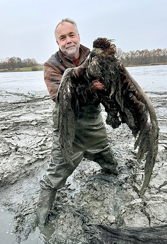 Pro uvízlého orla se Libor Šejna s kolegyní brodil hustým bahnem doprostřed rybníka.