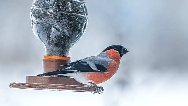 Většina ptactva, stejně jako třeba hýl obecný (na snímku), uvítá v krmítku slunečnicová semena.