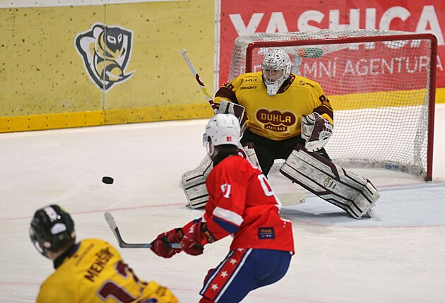 Momentka z utkání mezi Duklou Jihlava a Horáckou Slavií Třebíč ve čtvrtfinále play-off první hokejové ligy.